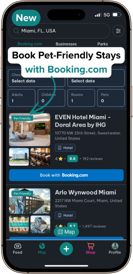 The Map:The interactive map helps you discover pet-friendly parks, trails, cafés, beaches, and services nearby, like vets or groomers, whether you're at home or traveling. Through our partnership with Booking.com, you can also explore and access pet-friendly hotel options with ease. View park amenities, photos, ratings and reviews, join a group chat for each park page, see who's visiting, and plan pet-friendly outings with confidence.